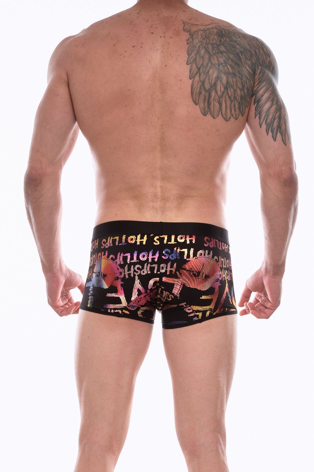 Черные трусы-боксеры с разноцветным принтом в виде надписей и губ.