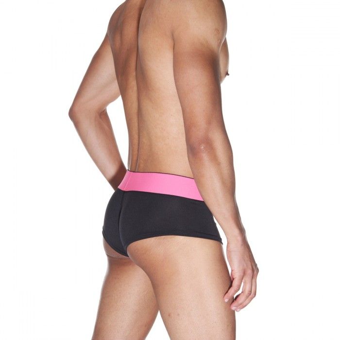 Мужские хипсы из эластичной черной ткани, с розовыми строчками и широким розовым поясом.