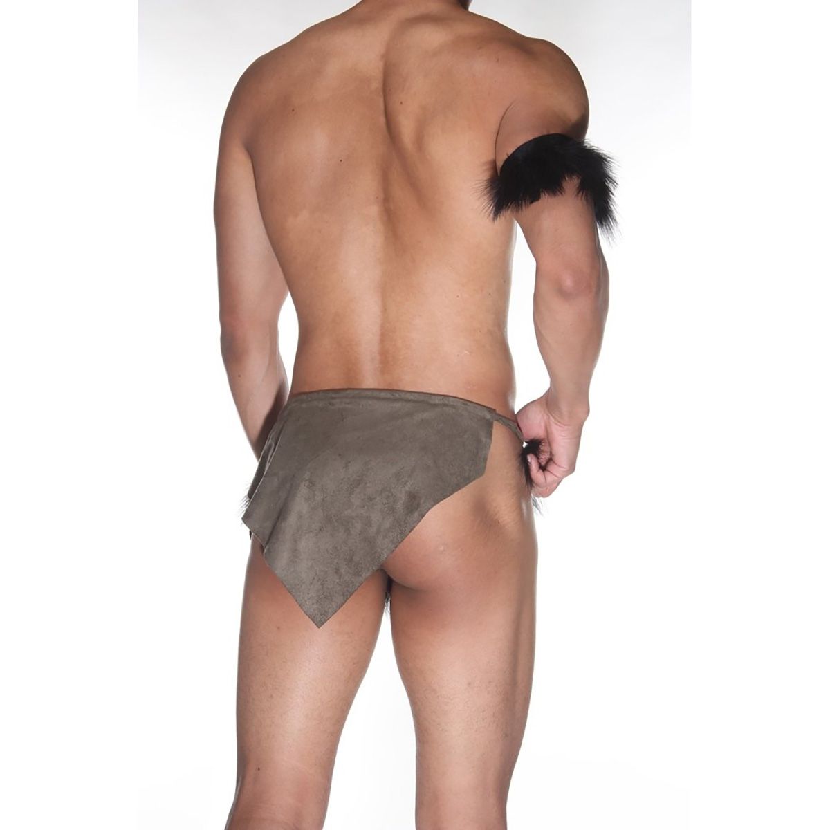 Открытый мужской костюм из переливающейся ткани. В комплекте идет повязка на руку с пушистым черным помпоном и повязка на бёдра с черным пушистым обрамлением. Идеально подойдет для игр и развлечений В комплекте: набедренная повязка, повязка на руку.