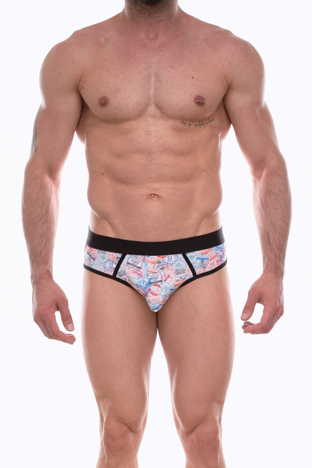 Мужские трусы-джоки с разноцветным принтом в виде штампов.