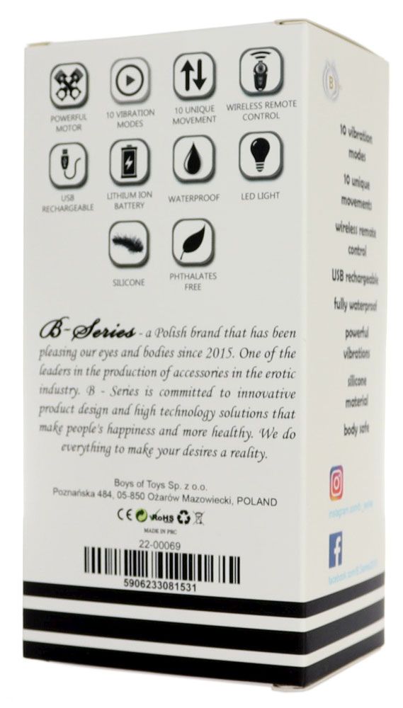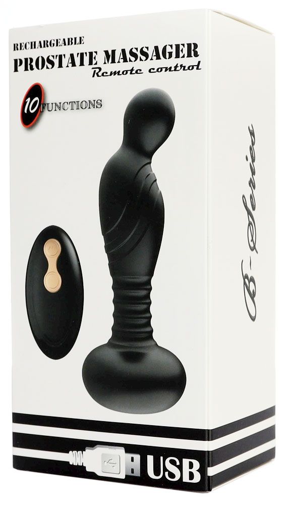Современный массажер простаты, оснащен 10 режимами вибрации, а движение вверх-вниз (10 поступательных режимов) добавляет еще больше удовольствий. Массажером можно управлять с помощью пульта дистанционного управления. Водонепроницаем. Зарядка осуществляется с помощью USB. Рабочая длина - 9 см.