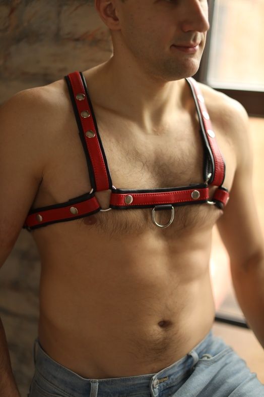 Яркая и стильная, очень качественная мужская портупея, полностью выполненная из натуральной кожи. Лицевая часть выполнена из красной кожи, а подклад - из черной, очень мягкой и приятной к телу. Фиксация происходит с помощью кнопок, что позволяет легко и удобно регулировать посадку аксессуара по фигуре. Портупея декорирована надежными сварными металлическими кольцами, к которым можно при желании пристегивать дополнительные аксессуары и комбинировать в разных вариантах. Портупея двусторонняя: ее можно носить по разному, меняя положение.