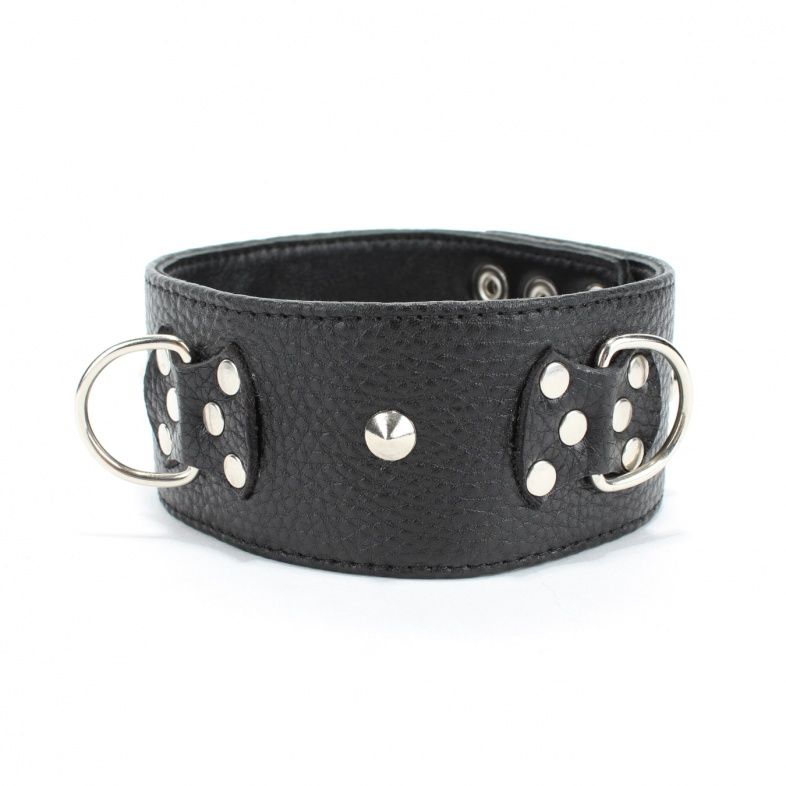 Черный кожаный ошейник с короткими шипами. Имеет три кольца для карабинов, три ряда заклепок-застежек. Размер регулируется. Ширина - 5,4 см.