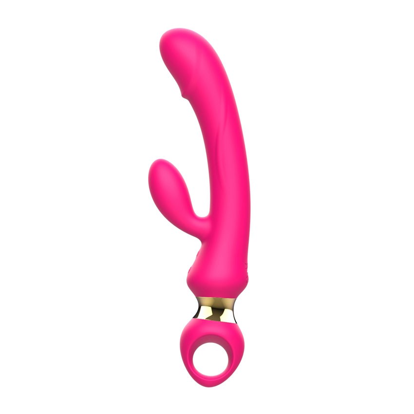 Розовый вибратор-кролик с ручкой-кольцом. 10 режимов вибрации. Рабочая длина - 13,3 см.
